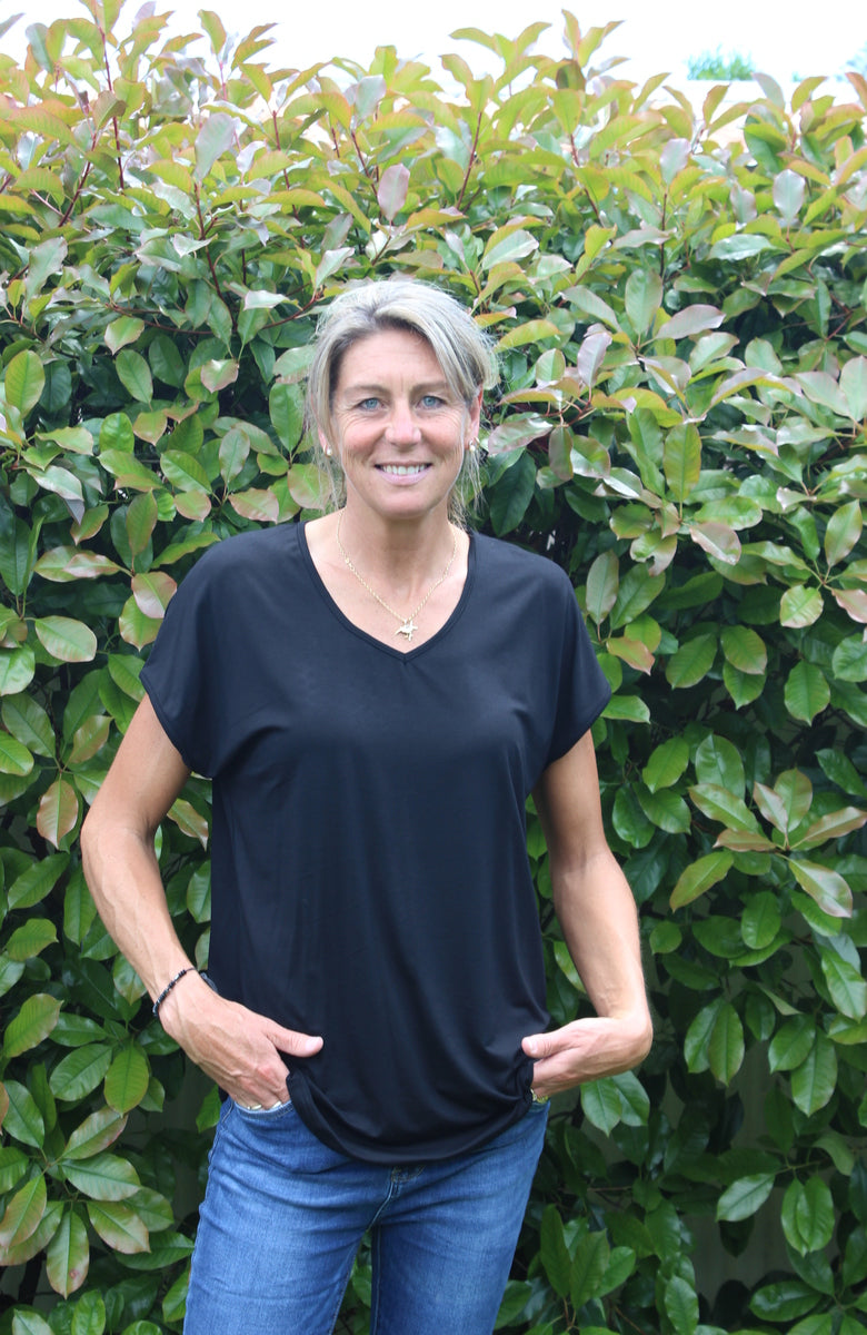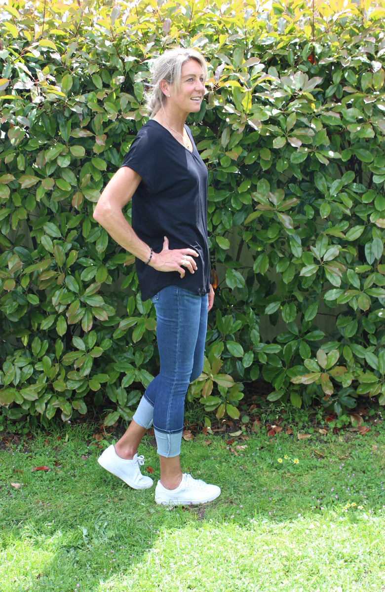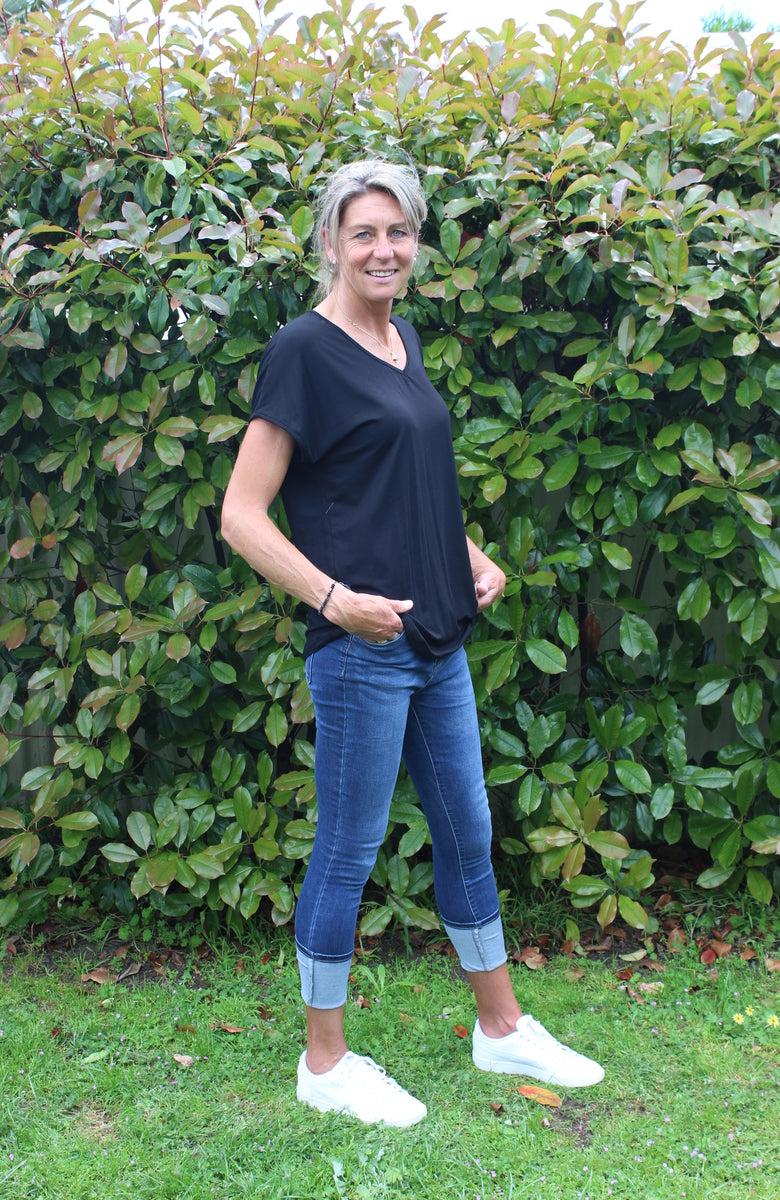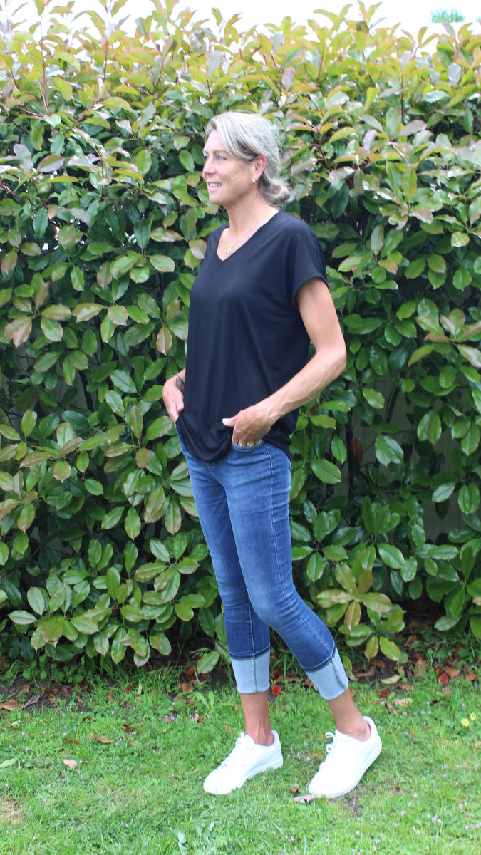 Gorgeous breathable viscose spandex that feels amazing to wear. Slight curved hem to elevate it from a basic tee. Great v-neck and nice drape.