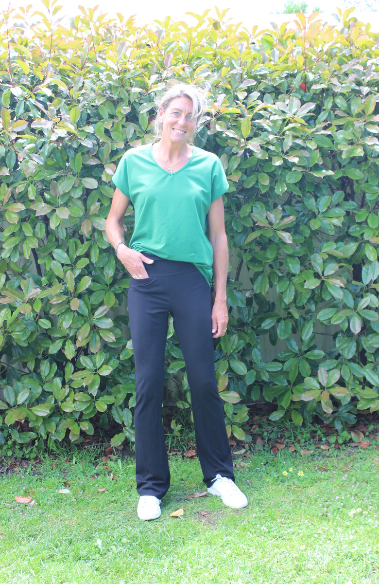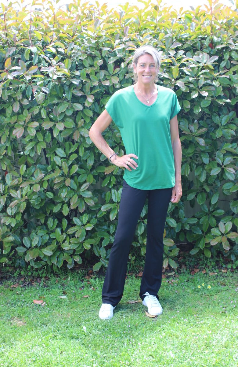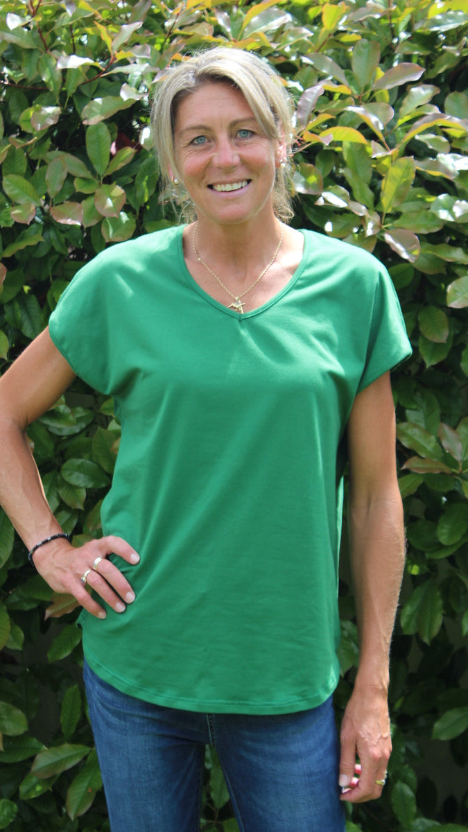 Gorgeous breathable viscose spandex that feels amazing to wear. Slight curved hem to elevate it from a basic tee. Great v-neck and nice drape.
