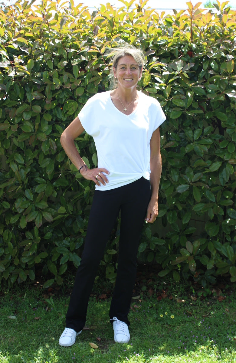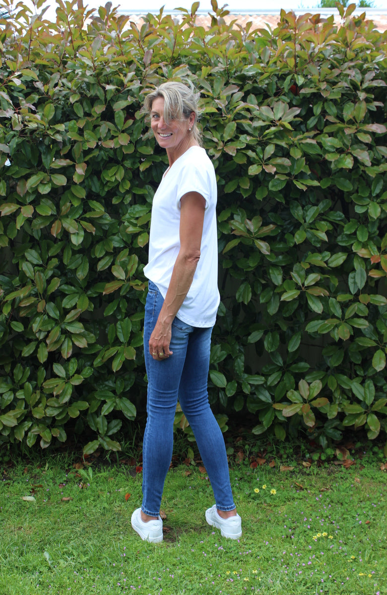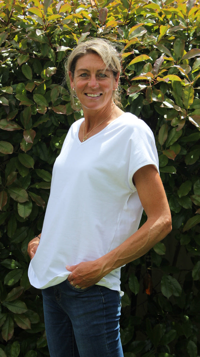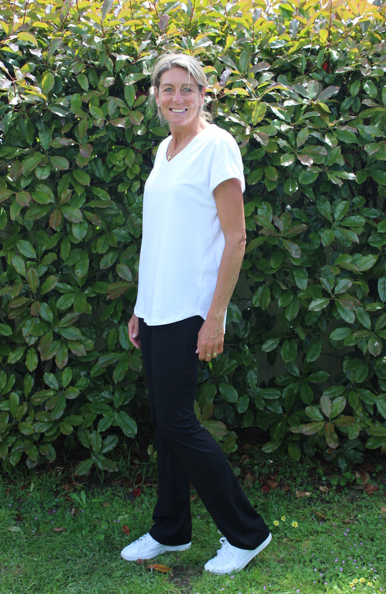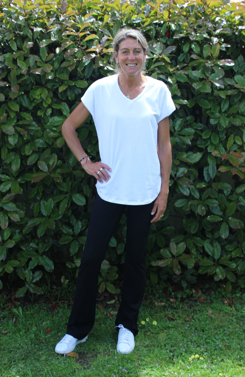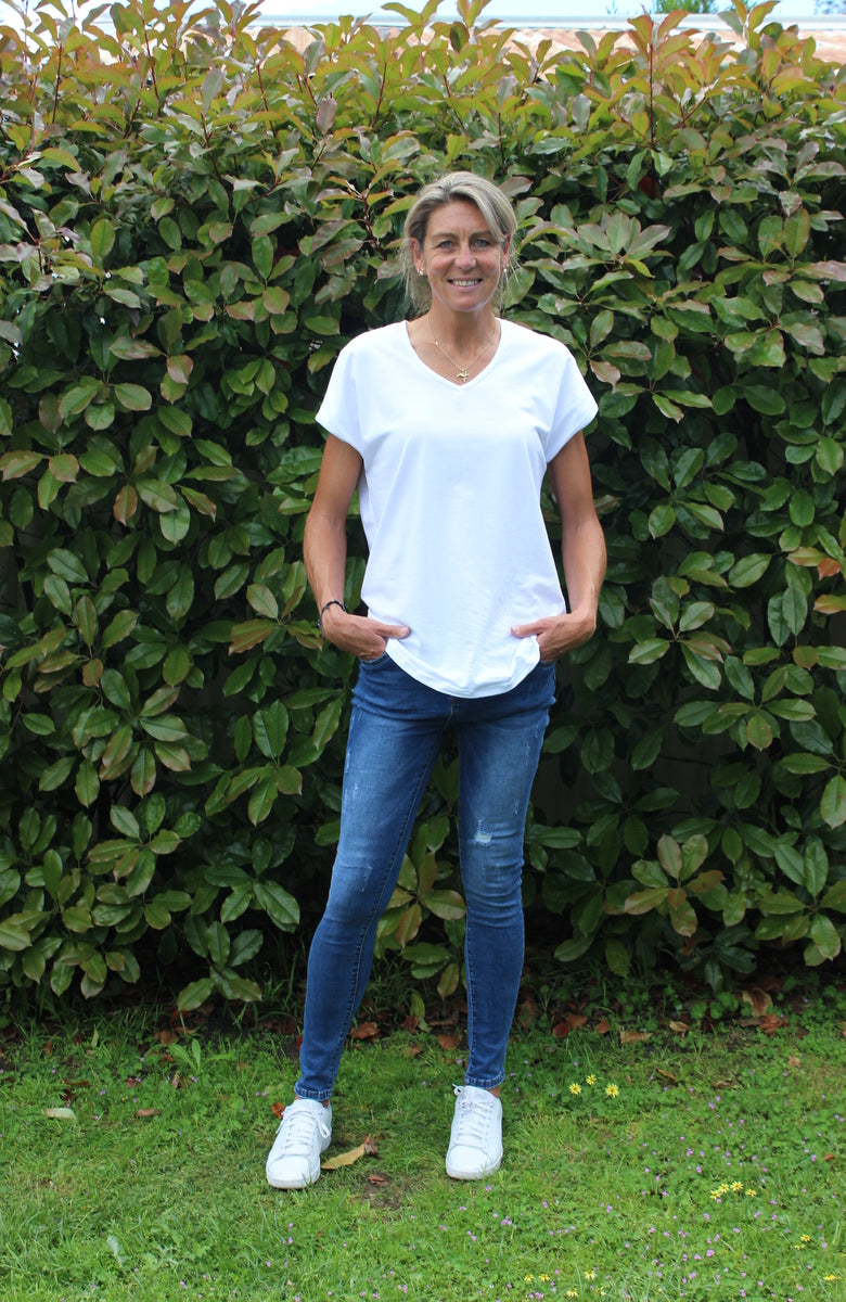 Gorgeous breathable viscose spandex that feels amazing to wear. Slight curved hem to elevate it from a basic tee. Great v-neck and nice drape.