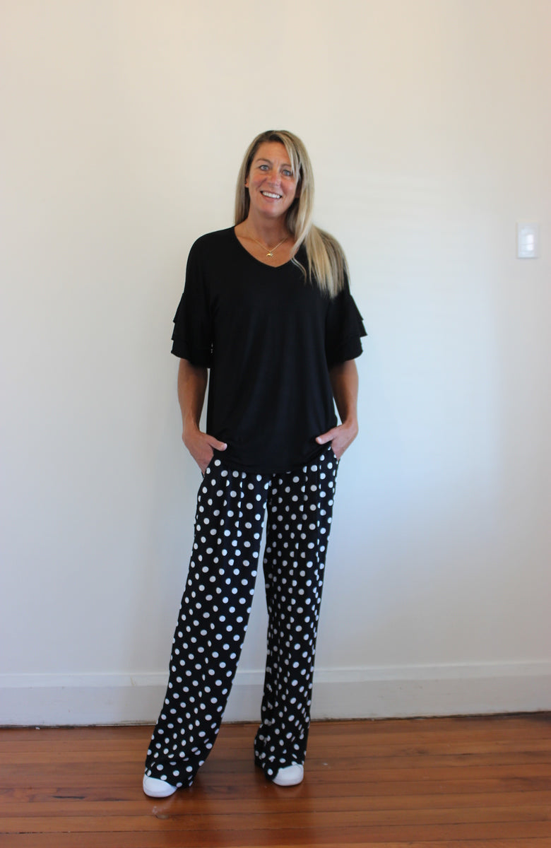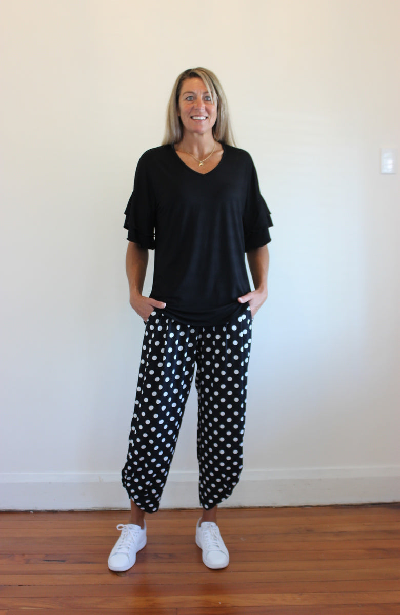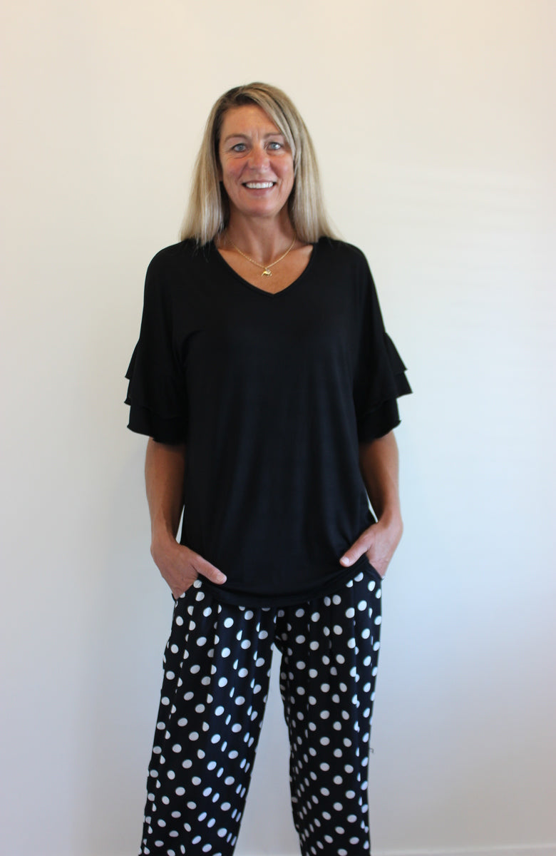 Super cute loose fit top with a double frill detail on the sleeves.