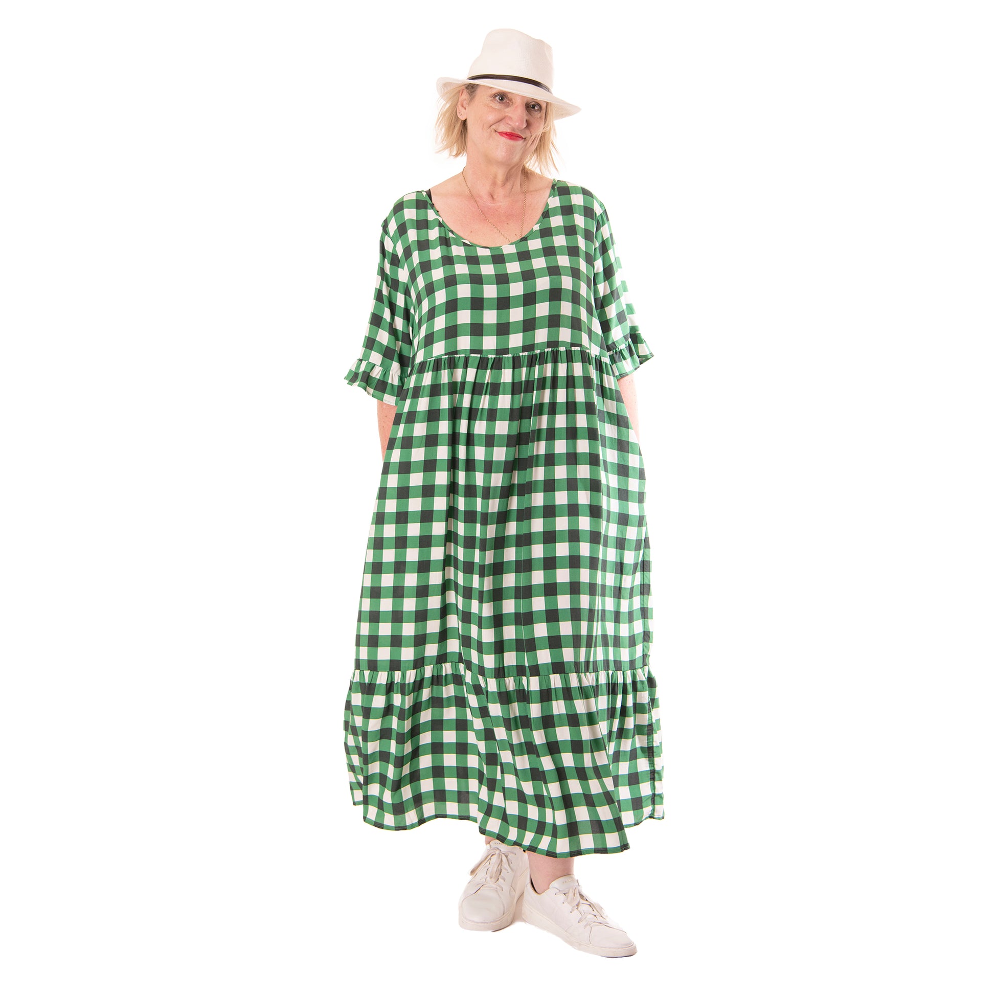 Stunning in green gingham, loose fitting with gathers & pockets!