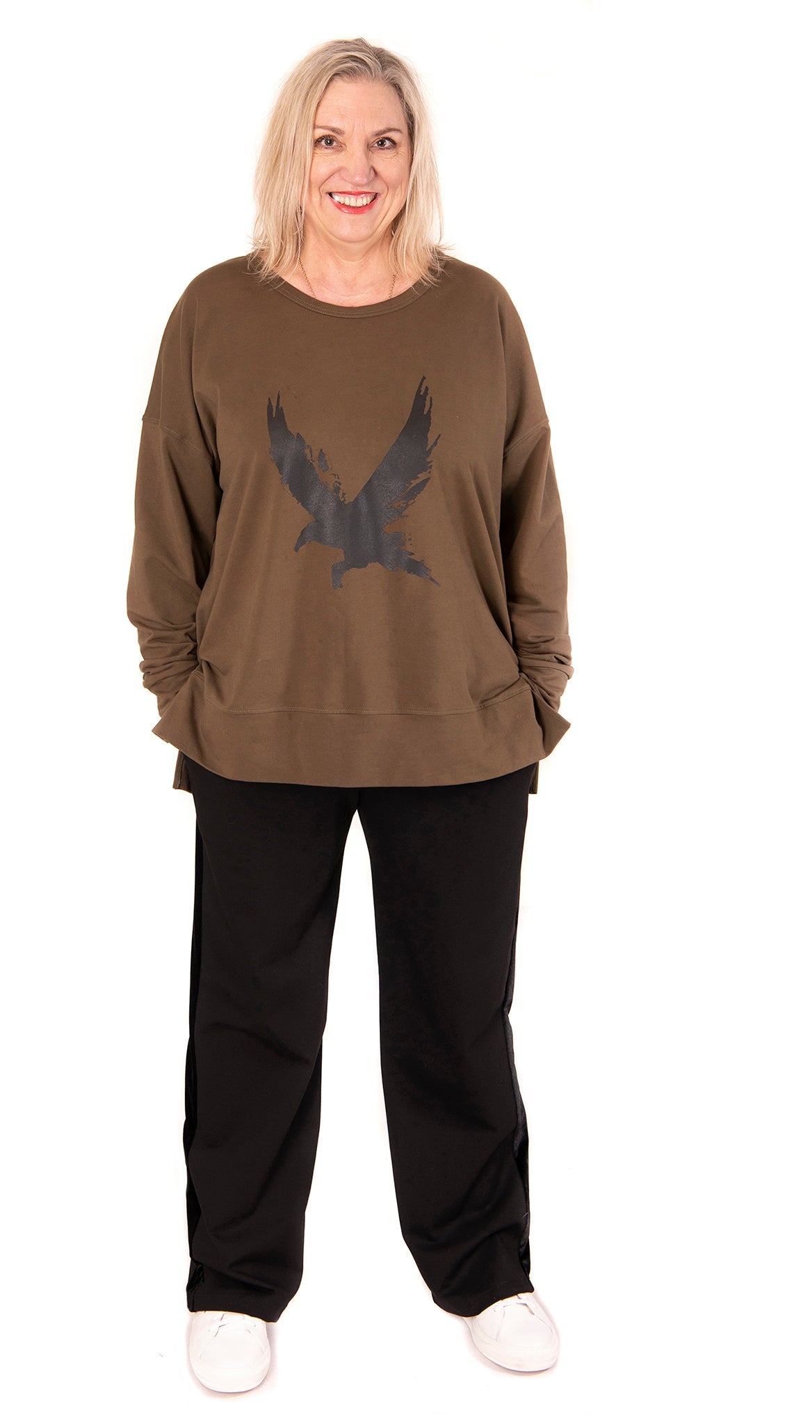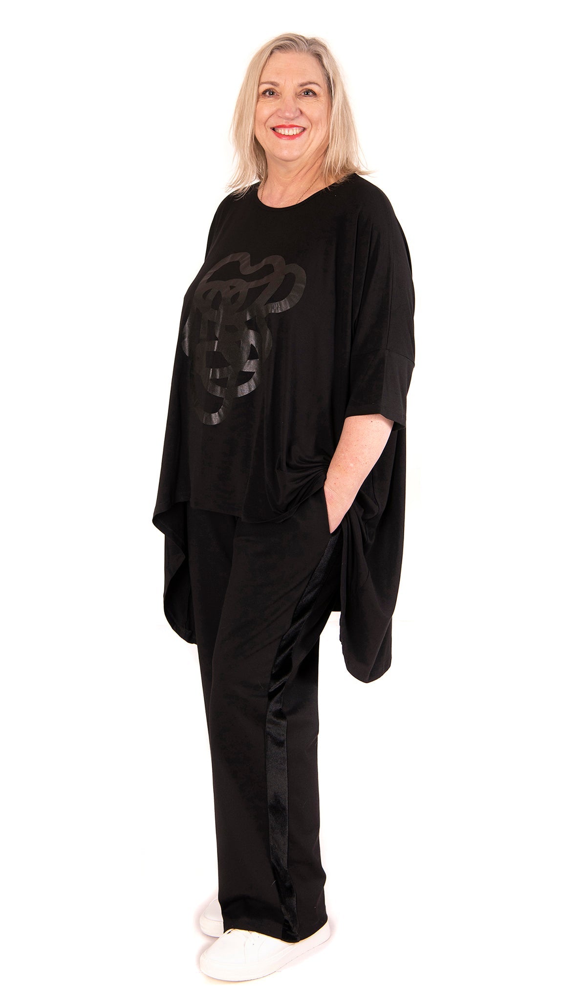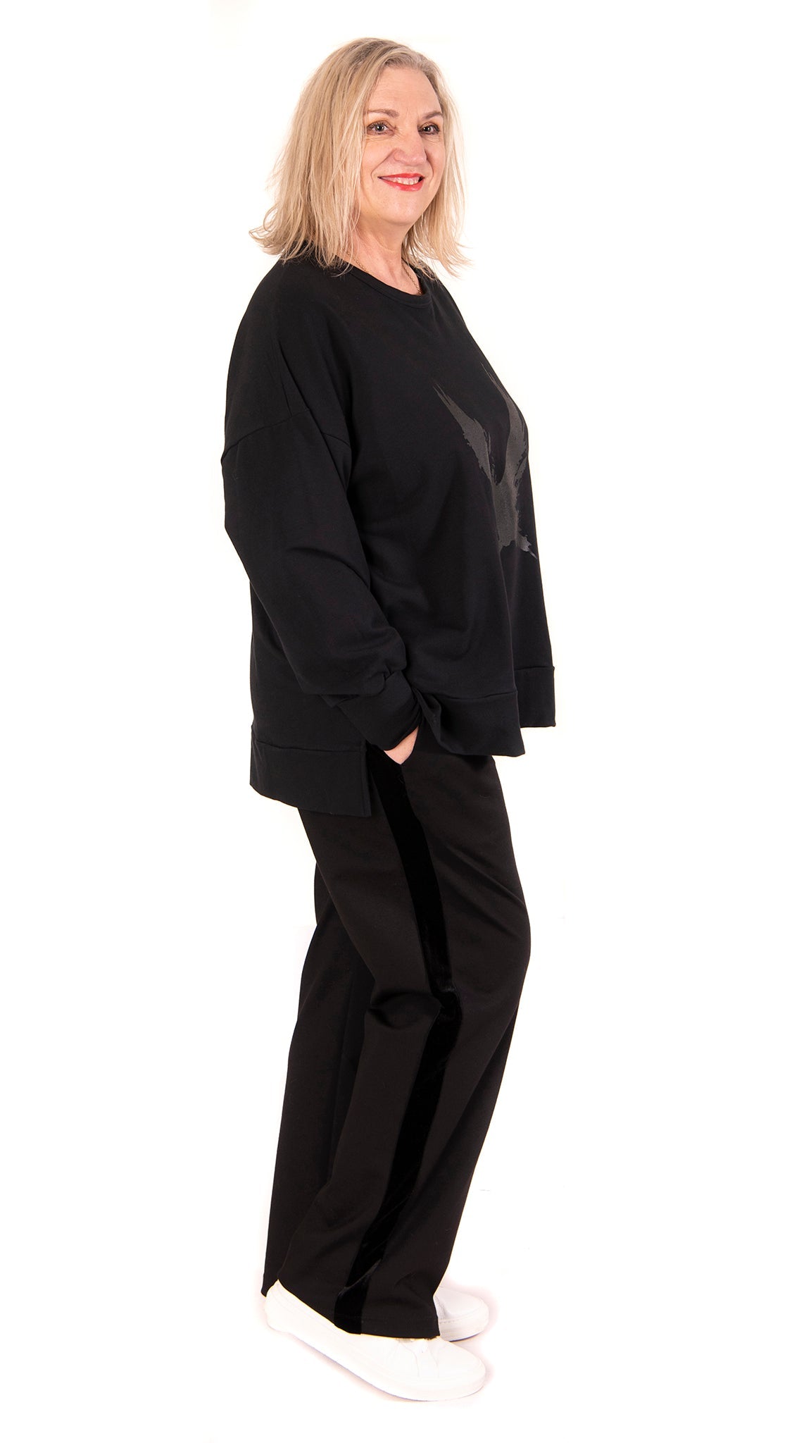 Warm sweat-shirting with contrast velvet leg stripe. The new leg shape/drape on these is amazing.
