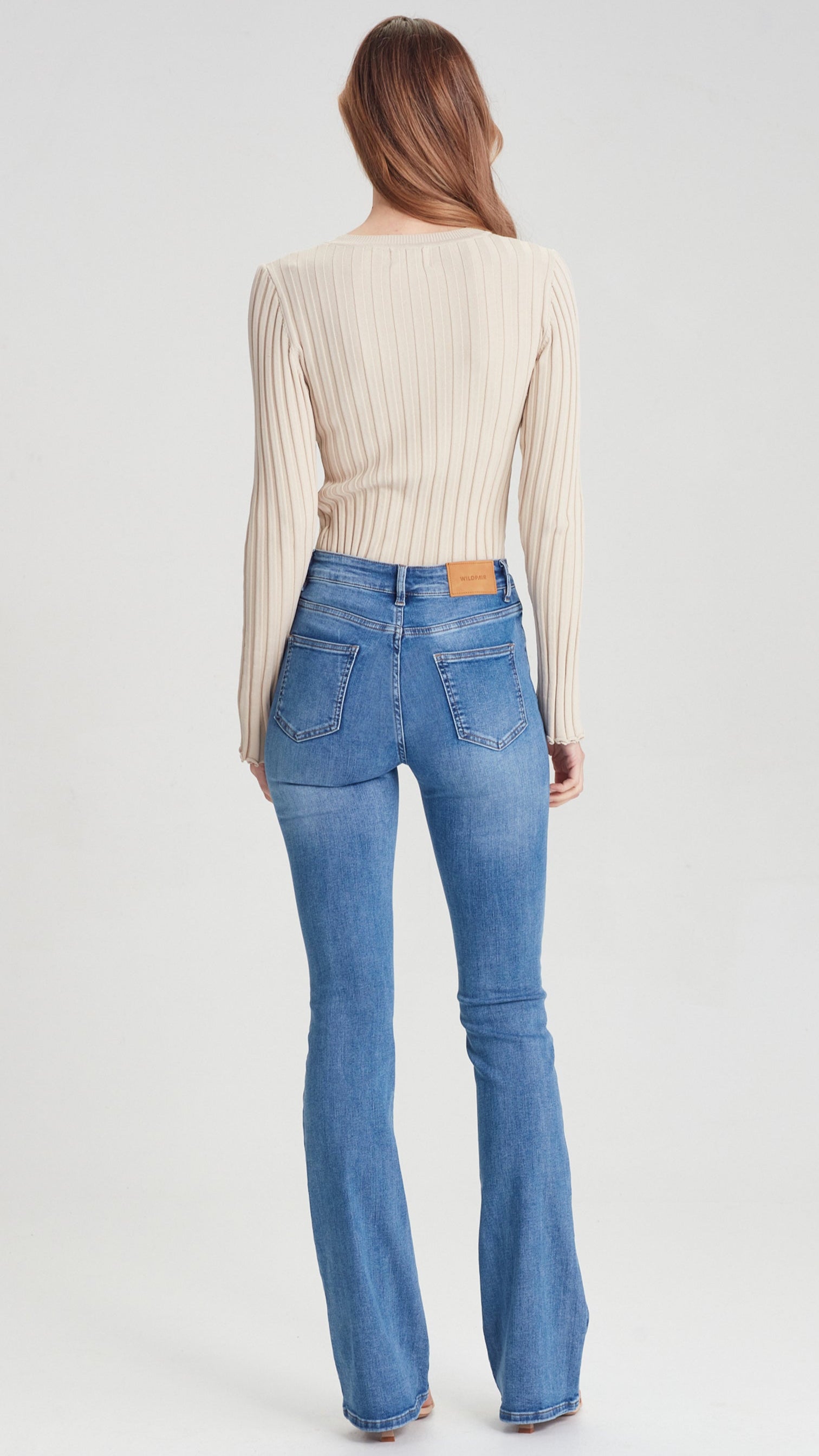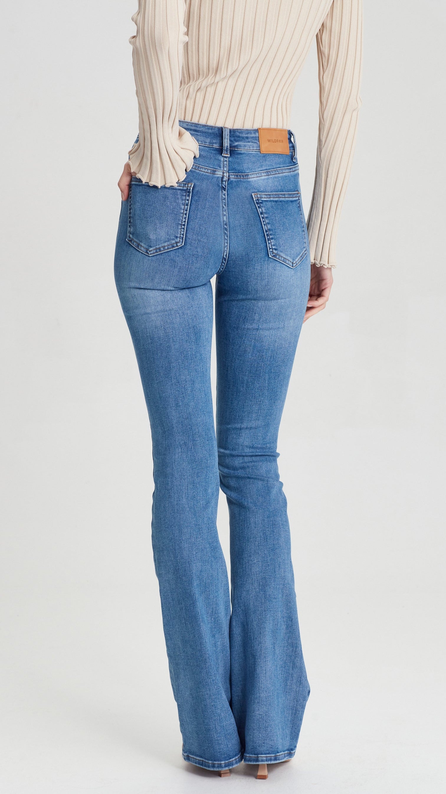 Cool slightly flared mid-blue jean. Super flattering on with great stretch, & comes in 2 long leg lengths.