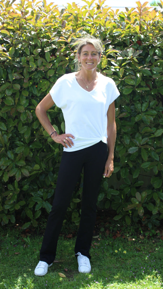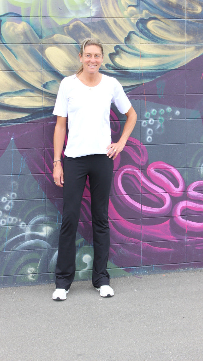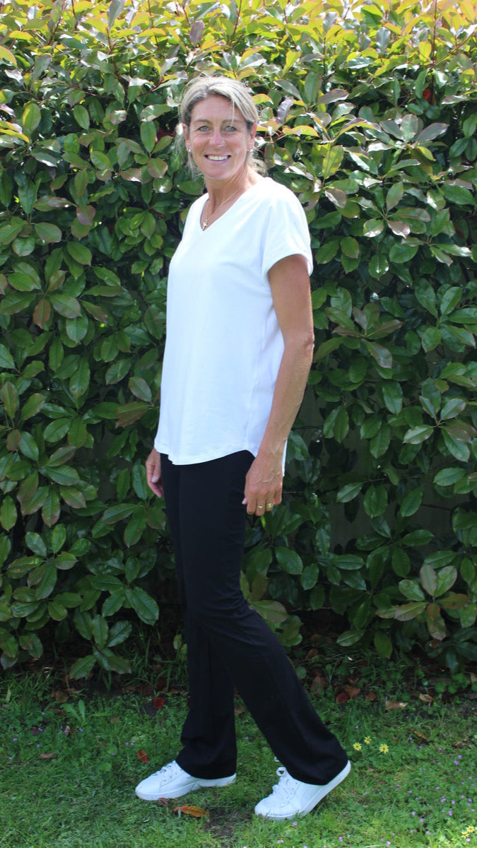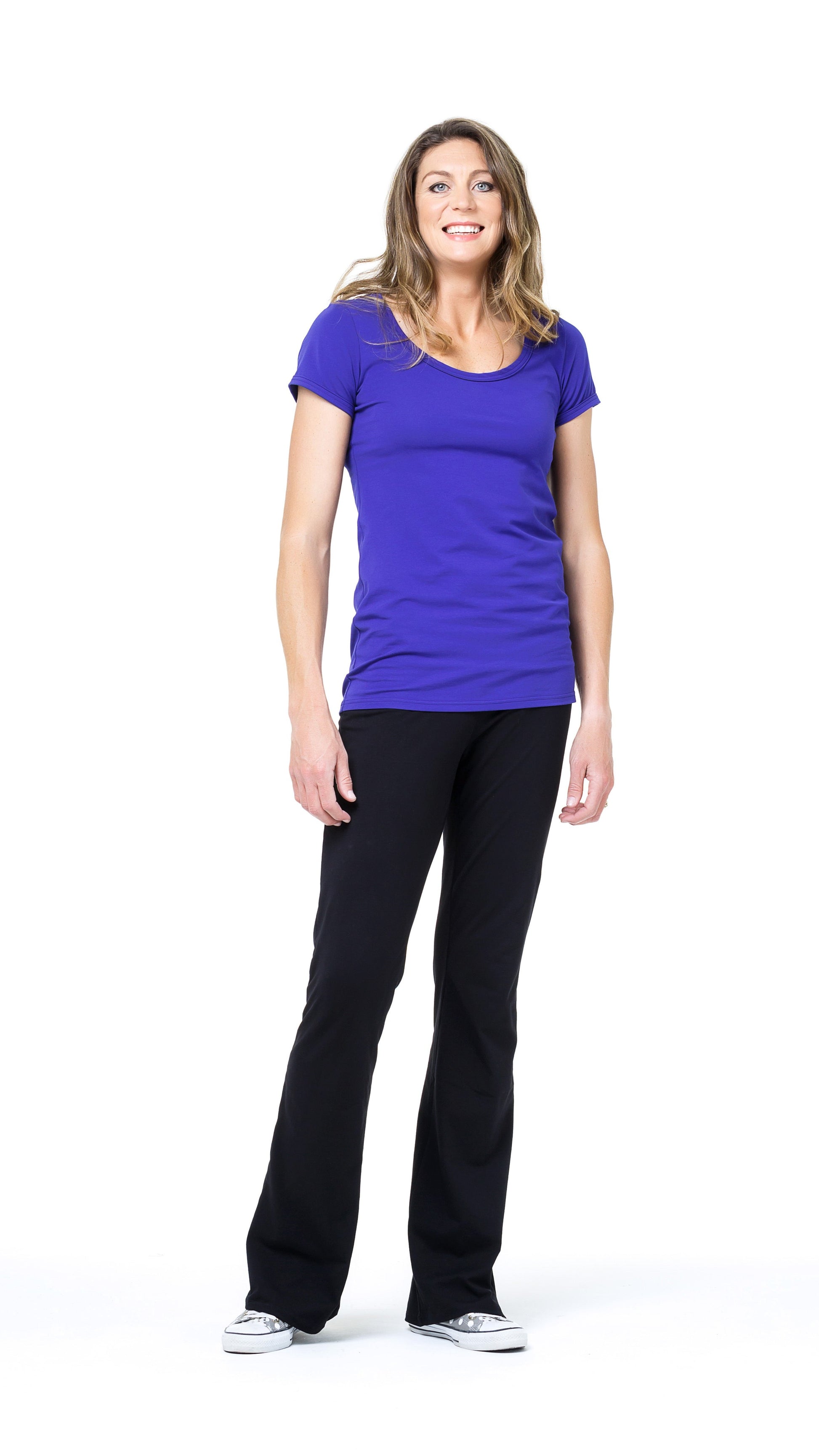 Slight bootcut for coverage over sneakers. Elastic waistband, High waist and indiscreet pocket for key/gym card.
